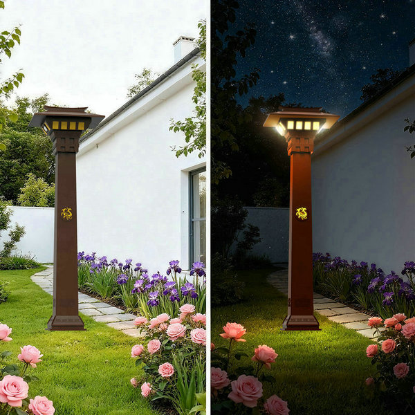 This courtyard lamp integrates traditional Chinese architectural elements (such as Hanque-style roofs and mythical beast patterns) with modern LED lighting technology. It is a design-driven LED luminaire that combines the solemn elegance of Chinese classical aesthetics (symmetrical structure, golden mythical beast decorations) with efficient LED illumination. While inheriting the cultural connotation of Chinese traditional art, it achieves artistic and functional lighting through LED sources, serving as a masterpiece in outdoor spaces that blends cultural heritage and visual appeal.